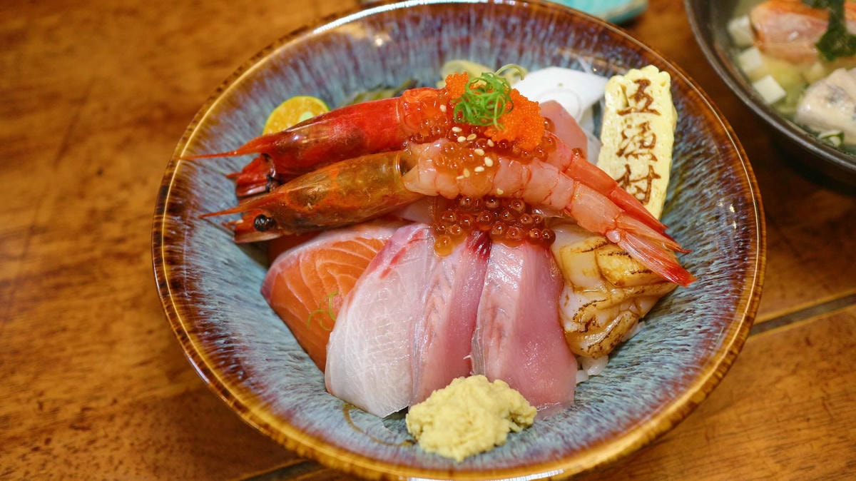 真的如網友說的料多到滿出來的海鮮丼飯 , 厚切刺身 , 入口滿滿的油香讓人著迷 , 這樣一碗一次能吃到7款左右不同的當季海鮮 , 是不是很幸福啊 , 五漁村丼飯屋魚貨種類看當天進貨的情形 , 再由師傅現場搭配