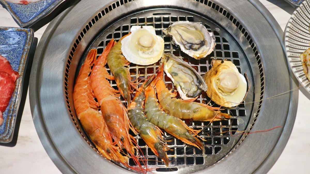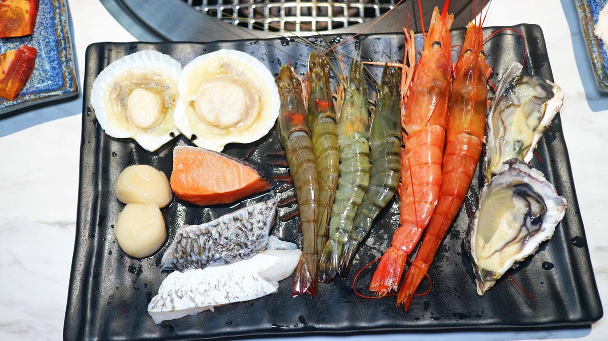 澎湃又豪華的食材 , 炎上燒肉的海鮮種類真的太給力了啦 , 肥美生蠔、天使紅蝦、黑虎蝦、藍鑽蝦種類蝦Q彈又飽滿 , 油脂香甜及軟嫩鮭魚、細緻軟嫩鱸魚、Q彈的扇貝讓人好喜歡、鮮美又肥嫩干貝