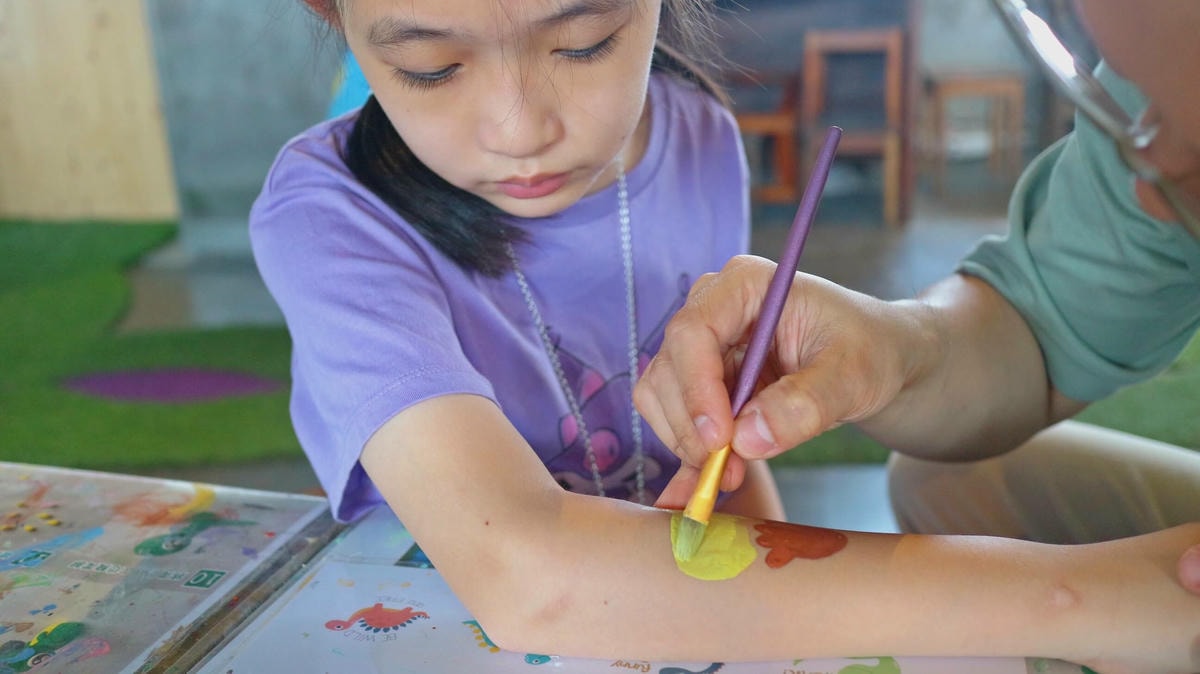 專人人體彩繪 , 一人選一個恐龍圖樣 , 可以選擇畫在手上 , 腳上或是臉上 , 依個人喜好表現自我區