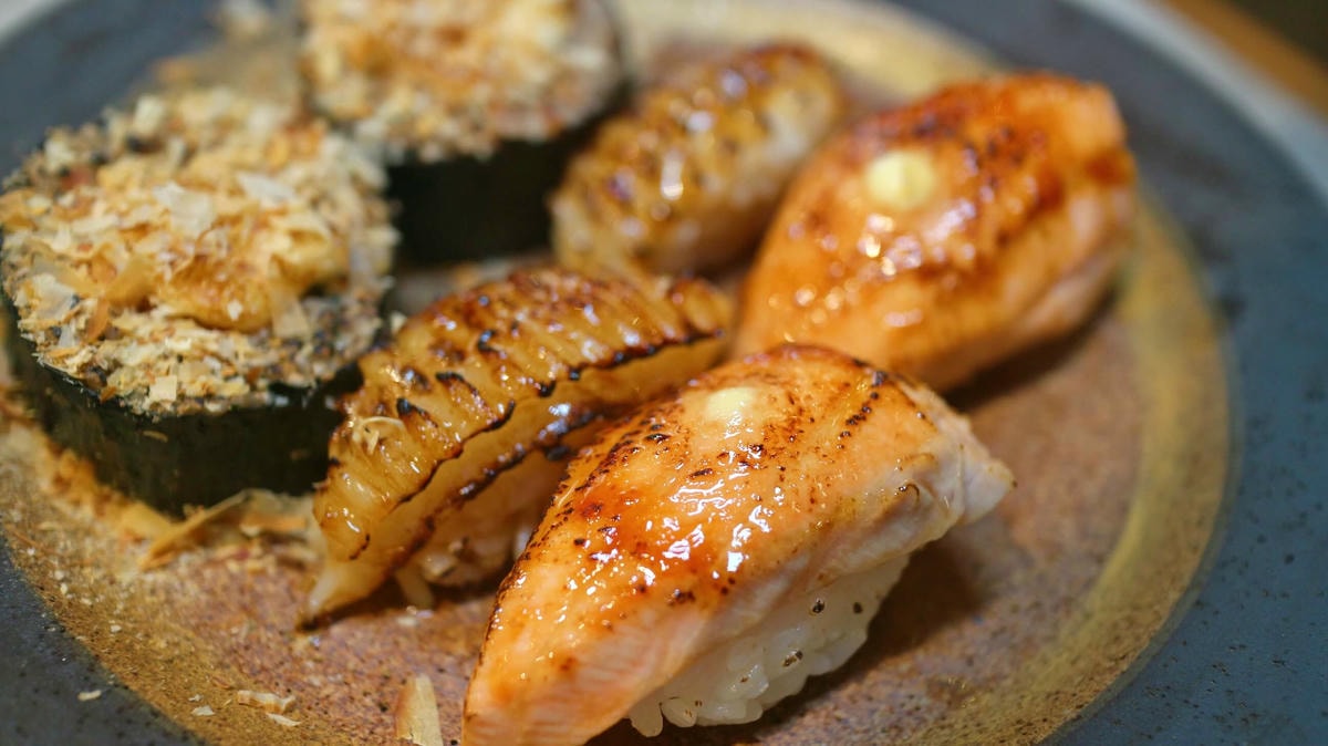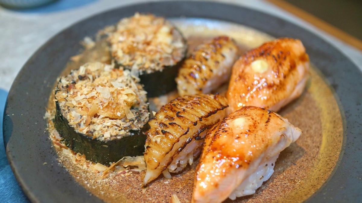 鮪魚肉質甜美有彈性 , 鮮嫩帶油脂特別香 , 比目魚在嘴裡如同奶油一般那樣化開 , 鮮甜滑順 , 讓人著迷 , 海苔壽司精緻又美味味道相當清爽