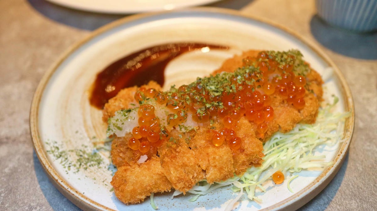 啵啵日式豬排佐鮭魚卵絕對不只是嘩眾取寵的菜色 , 豬排厚度很有誠意 , 大口咬下肉汁濃香 , 是一道好看又好吃