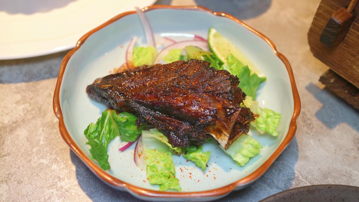 一上以為是炭烤豬肋排之類的菜色 , 咬一大口才發現是魚下巴 , 這烹調方式特別又好吃 , 魚肉細緻嫩口 , 手擠上一點檸檬更增添了一份酸甜清爽的感覺